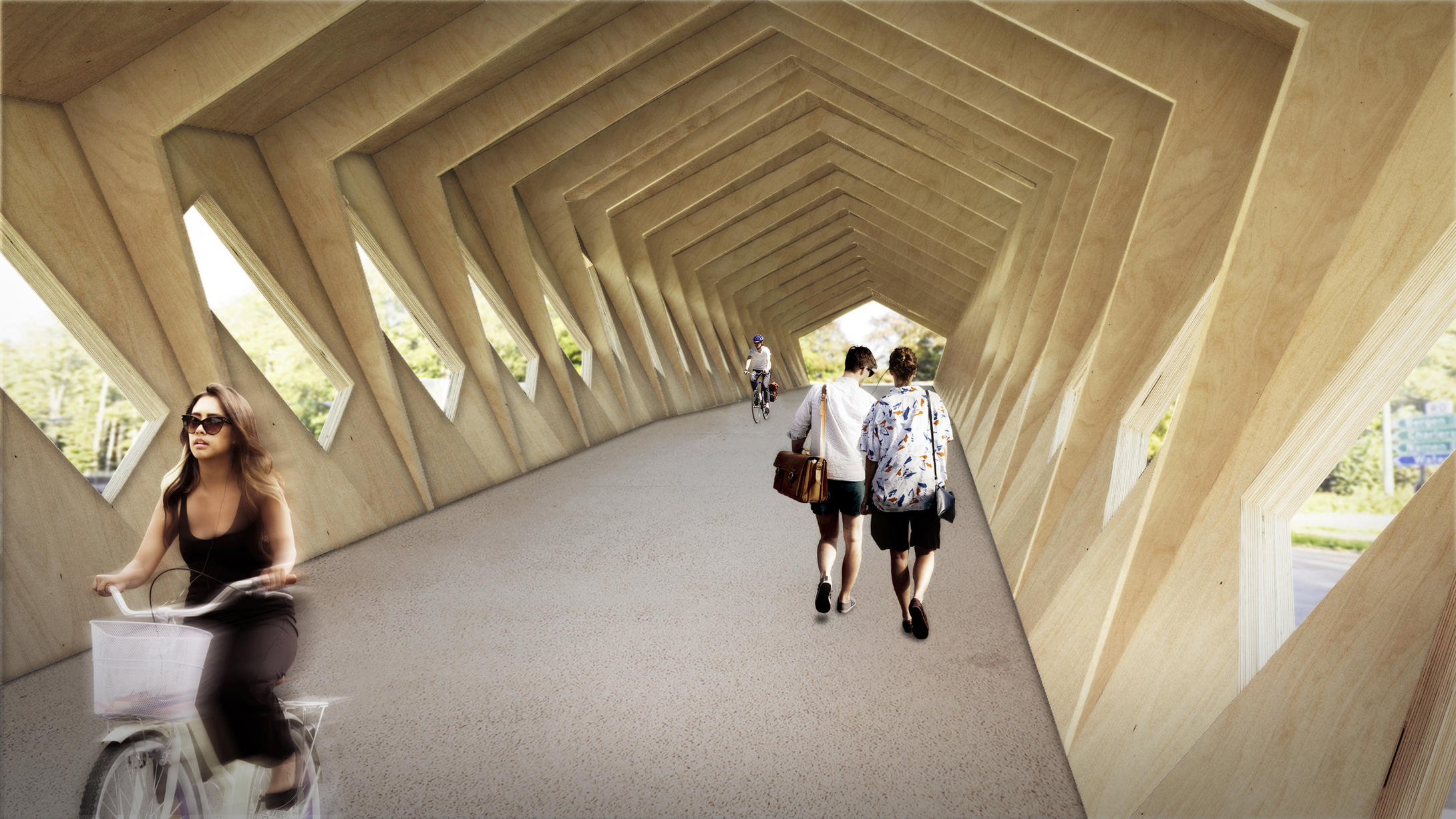 Der Querschnitt der Brücke besteht aus einer Dachkonstruktion, Außenwänden und dem Brückendeck. Die einzelnen Elemente sind durch eine Reihe von Schrägschrauben miteinander verbunden, um Scherkräfte zwischen den einzelnen Paneelen zu übertragen.