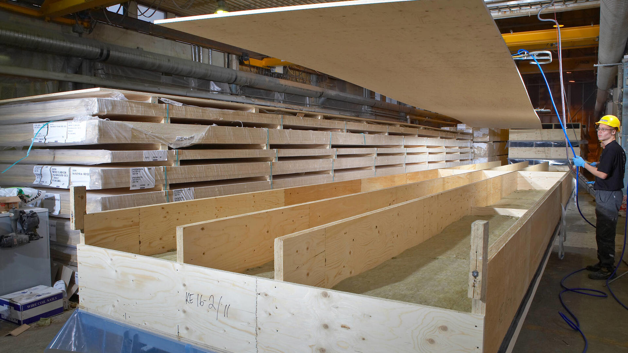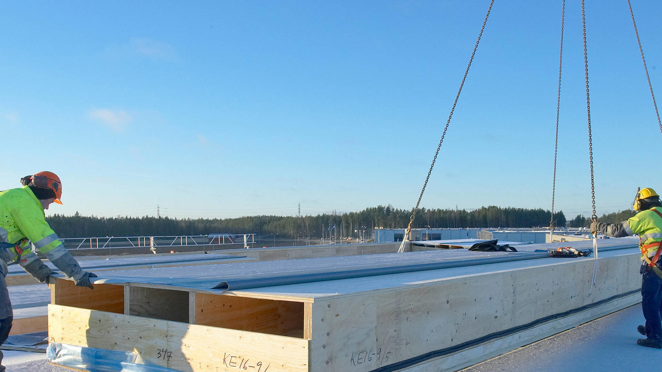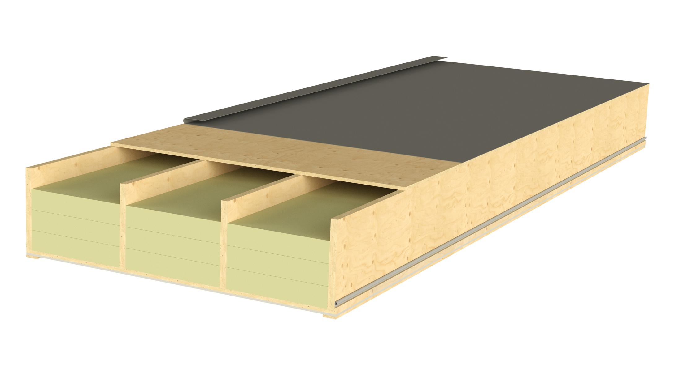 Kerto LVL S-beam is used as a rib and Kerto LVL Q-panel as paneling. The panel thickness and rib dimensions can be adjusted according to technical requirements. Openings for ventilation and electrical installations can also be installed inside the elements. The element manufacturer glues the roof system in the factory using screw or nail press bonding, thereby transferring a large part of the added value to itself. We advise on the introduction and optimization of production technology.