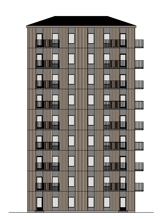 The construction adheres to Swedish regulations and is designed as an 8-storey residential building with a floor plan measuring 20 x 16 meters. It meets the fire safety requirements with a Fire class R90 for load-bearing walls and R60 for floors. The building ensures acoustic comfort with partition walls classified as sound class B, based on recommendations from an acoustic designer.