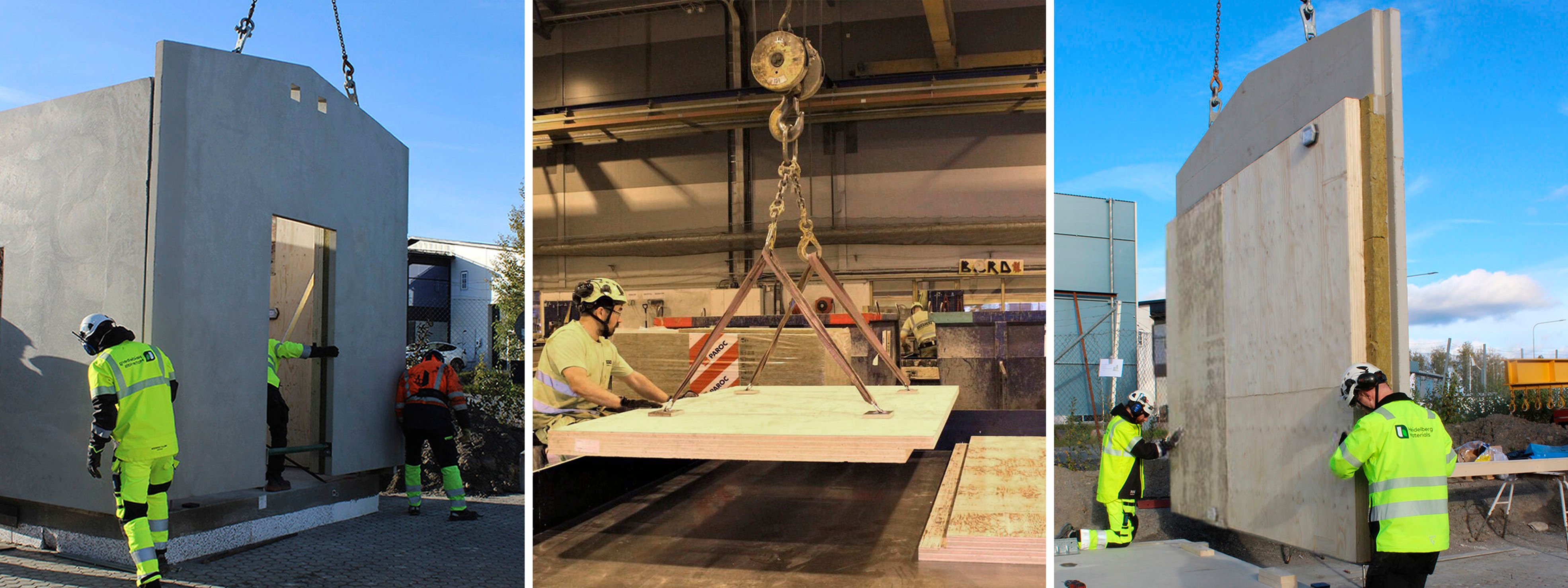 The hybrid wall element is a facade element in a sandwich construction, featuring an outer layer made of climate-improved concrete, intermediate insulation, and a load-bearing inner panel made of strong and material-efficient laminated veneer lumber, Kerto® LVL. The element has approximately 30-50% lower climate impact compared to an equivalent traditional concrete sandwich element, and it is significantly lighter, which also affects the overall climate impact of the entire construction project. “Transportation to the construction site can be reduced because we can transport twice as many elements in the same shipment,” explains Daniel Eriksson.
