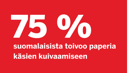 Paperi on käytännöllinen. Otat yhden arkin, kuivaat kädet omassa tahdissa ja homma on selvä. Ei odottelua, ei arpomista riittääkö kuivaajassa puhku tai onko tekstiilipyyherulla jumissa. Ja kun paperia on saatavilla juuri silloin kun tarvitset, käyttökokemus on mutkaton ja miellyttävä.
