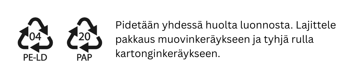 Pakkauksemme valmistetaan 50 % kierrätysmuovista, ja ne ovat 100 % kierrätettäviä. Pakkauksilla on tärkeä tehtävä tuotteidemme hygienian, puhtauden ja pehmeyden suojaamisess