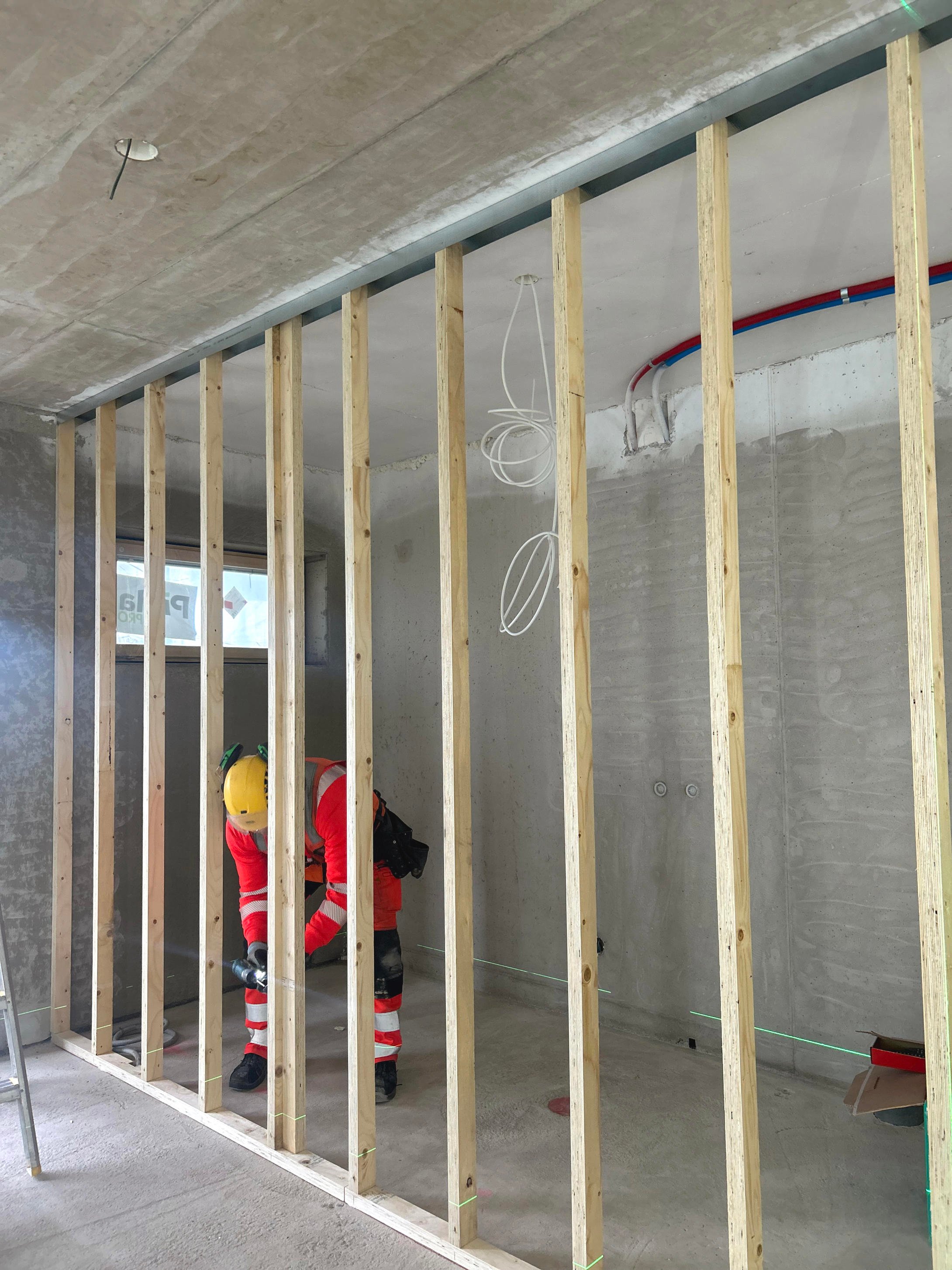 Lujatalo has built all three Pikiruukki tower buildings, which has enabled continuous optimization of material selection and quantities as the project progressed. Each building has used Kerto LVL T-studs for partition wall studs. "The material selection for partition wall studs was ultimately a procurement decision, but the choice of T-stud was supported by its technical properties, which enabled the creation of high-quality and cost-efficient partition walls. The product also solves several partition wall construction challenges – T-stud is straight and experiences virtually no dimensional changes. This is a significant advantage, as using engineered laminated veneer lumber allows us to create high-quality, straight walls," describes Lujatalo's site manager Mika Palo.