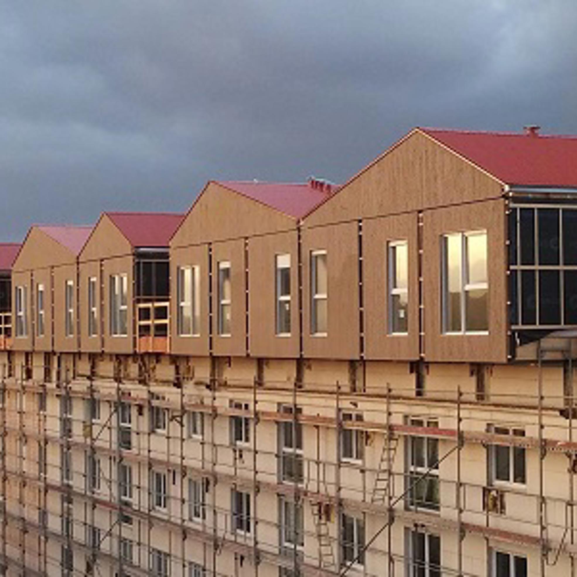 The construction work for the wooden extensions in the Beauregard neighbourhood of Poissy began in September 2016. The building renovation project was managed by the property owner Vilogia and the Parisian architectural agency Virtuel Architecture. The 33 new apartments, each with 2–3 bedrooms, were constructed on the rooftops of three buildings, with a reinforced structural design. The modular housing units were installed at a rate of roughly one to three apartments per day. The construction project also included installation of three elevators and extension to the staircases.