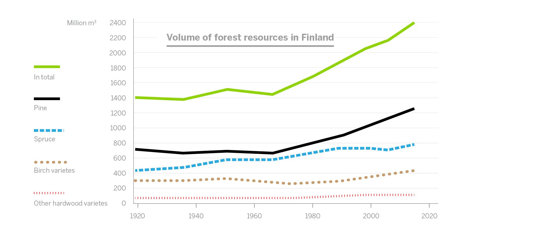 According to Natural Resources Institute Finland’s latest measurements, there is now more wood in our forests than ever before. Over the past 50 years, the annual growth of forests has doubled, and the volume of growing stock now is 2.4 billion cubic metres. The forests are growing roughly at a rate of 110 million cubic metres a year, and sustainable felling opportunities amount to approximately 80 million cubic metres. The annual growth of forests now exceeds the amount felled and natural loss by over 20 million cubic metres.