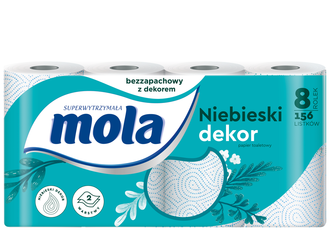 Mola Niebieski Dekor to wydajny, a zarazem delikatny papier toaletowy dla każdego typu skóry. Dwie wytrzymałe warstwy zapewniają komfort i wygodę na co dzień, nawet dla czułej skóry Twoich dzieci. Każda rolka to aż 156 listków papieru z pięknym niebieskim wzorem, który ożywi Twoją łazienkę.