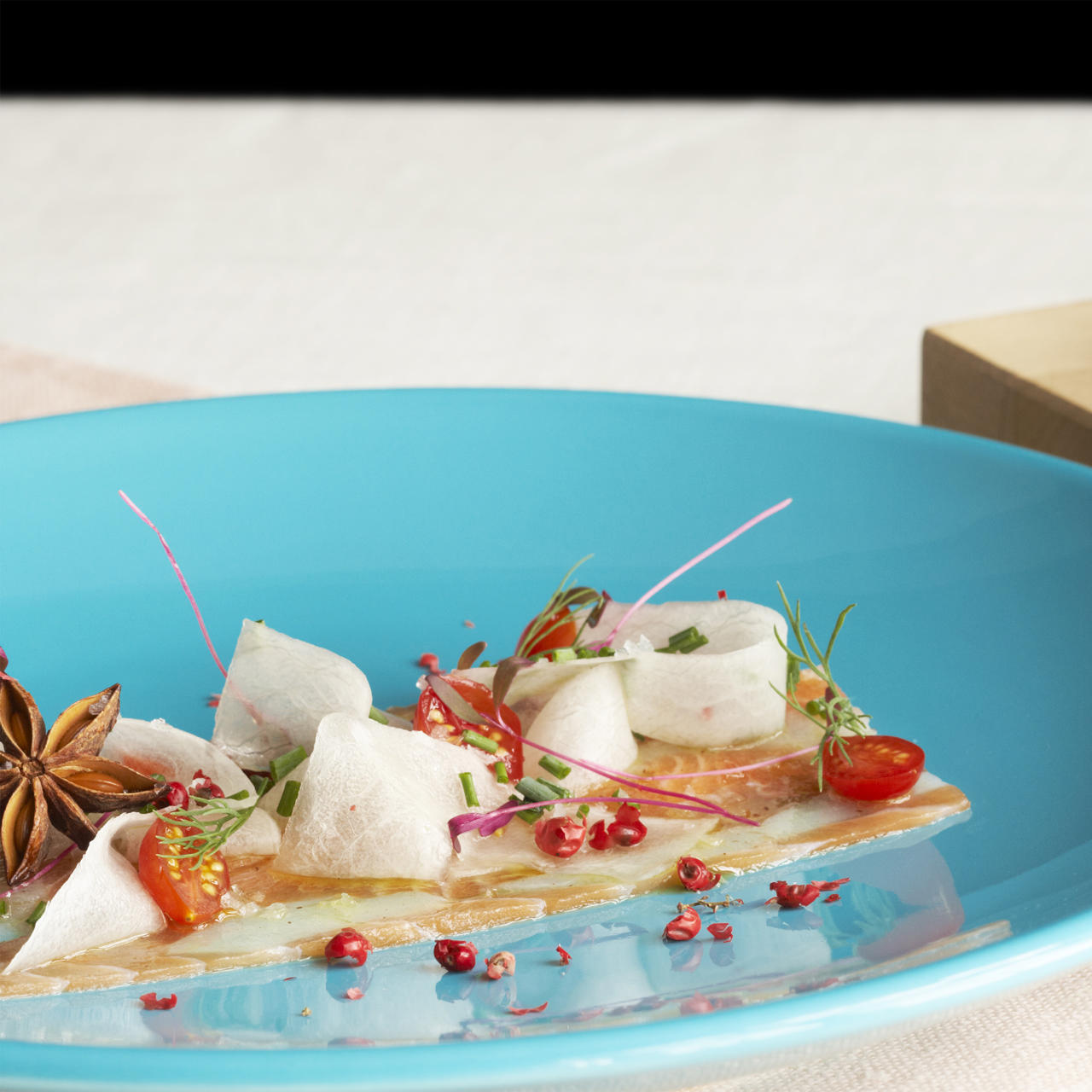 Trim the fillet, wrap in SAGA Cooking Paper, and put it in the freezer. Once the fillet has firmed up, remove it and thinly slice it over a piece of cooking paper - enough to fill a plate. Once done, place another sheet of cooking paper over the slices and make a new layer - continue until you have as many layers as you need servings.
